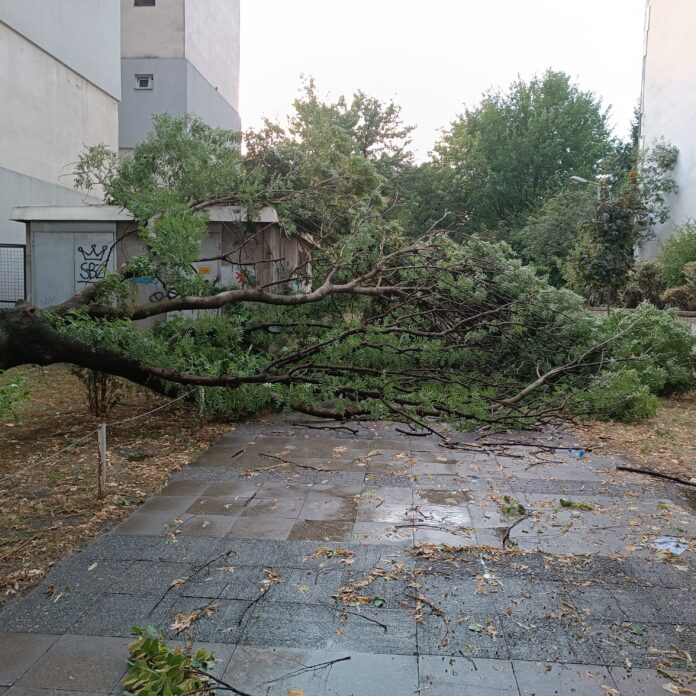 Силно невреме попладнево зафати поголеми делови од Македонија, вклучително и Скопје, предизвикувајќи прекин на електричната енергија и големи штети. Силниот ветер откорна дрвја, скршените гранки и градот оштетија возила, откорнати се делови од лимени покриви…