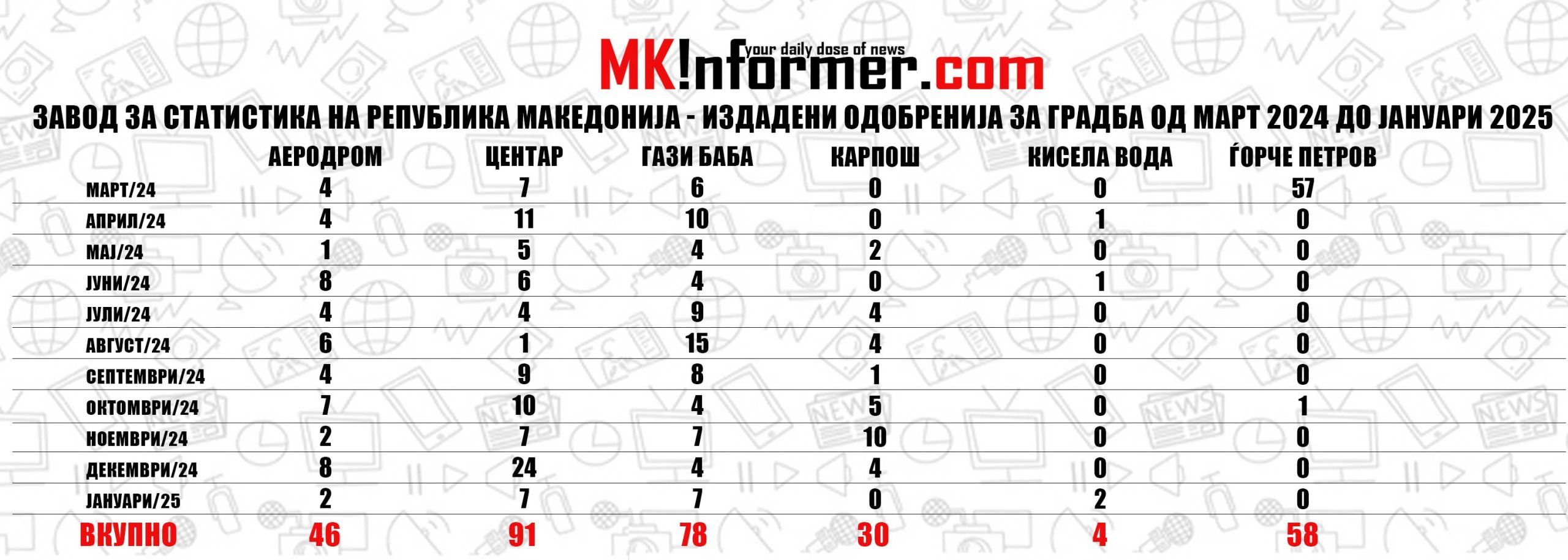 Редакцијата на МК Информер презема податоци од Државниот завод за статистика за издадени дозволи за градби по општини на ниво на Град Скопје од чии приложени бројки дојдовме до следните податоци за изминатата година.