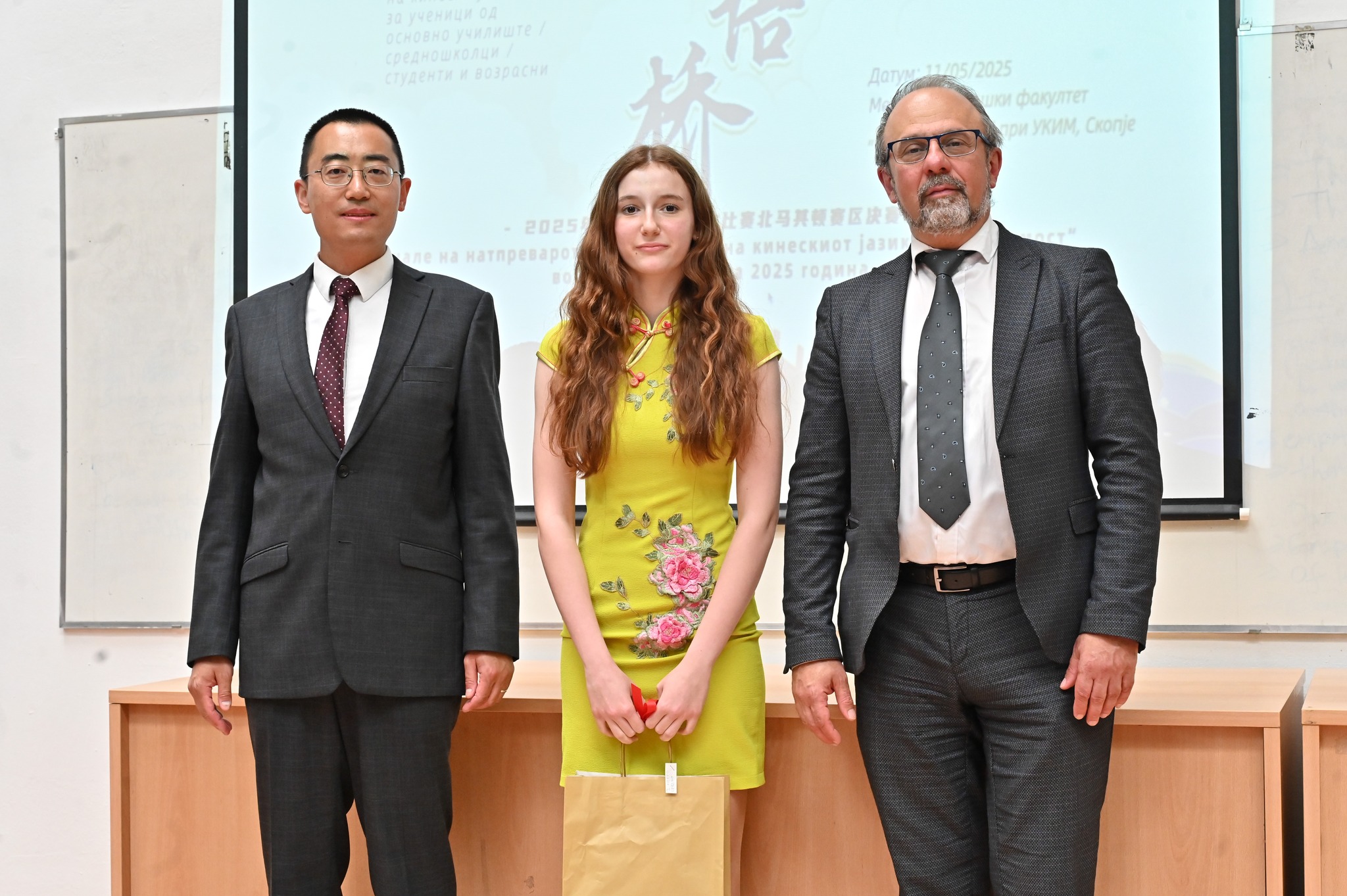 Почитувани присутни беа г-дин Ксу Леи, вршител на должност на кинеската амбасада во Северна Македонија, Проф. Александар Скопаловски, проректор на Универзитетот „Св. Кирил и Методиј“ во Скопје и проф. Лиао Веи, кинески директор на институтот Конфучие, кои упатија честитки и ги доделија наградите.