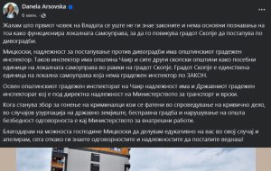 „Жалам што првиот човек на владата сеуште не гизнае законите и нема познавања на тоа како функционира локалната самоуправа, за да го повикува градот Скопје да постапова по дивоградби“, напиша Арсовска.