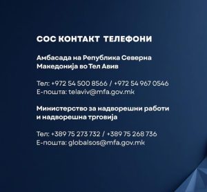 Согласно влошената безбедносна состојба на Блискиот Исток, Министерството за надворешни работи и надворешна трговија апелира до сите државјани на Република Северна Македонија кои се наоѓаат на територијата на Израел и Иран, доколку им е потребна конзуларна помош, веднаш да стапат во контакт со надлежните институции преку дежурните (СОС) телефонски броеви.