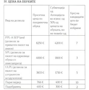 Директорот на АЦВ, Драги Стојаноски, вели дека финансирањето ќе опфати обуки на седум кандидати за стекнување дозвола за пилот на авион, на тројца кандидати за стекнување дозвола за пилот на едрилица, на пет кандидати за стекнување дозвола за пилот на ултралесни авиони, на 10 кандидати за стекнување на дозвола за пилот на параглајдер и на кандидати за стекнување на дозвола за падобранец.