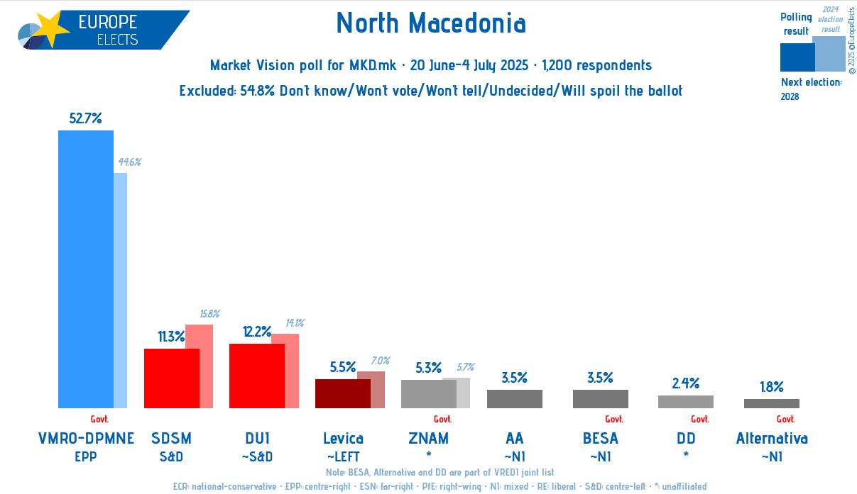 Повеќе од половина од испитаниците кои споделиле за која партија ќе гласаат на наредните избори, го избираат ВМРО-ДПМНЕ. Тука, ако се споредат резултатите на определените гласачи со минатите истражувања, пред локалните избори, ВМРО-ДПМНЕ, СДСМ и ЗНАМ имаат раст, а благ пад има кај Левица и ДУИ. Падот на Вреди е поврзан со напуштањето на коалицијата на Алијанса за Албанците на Арбен Таравари.