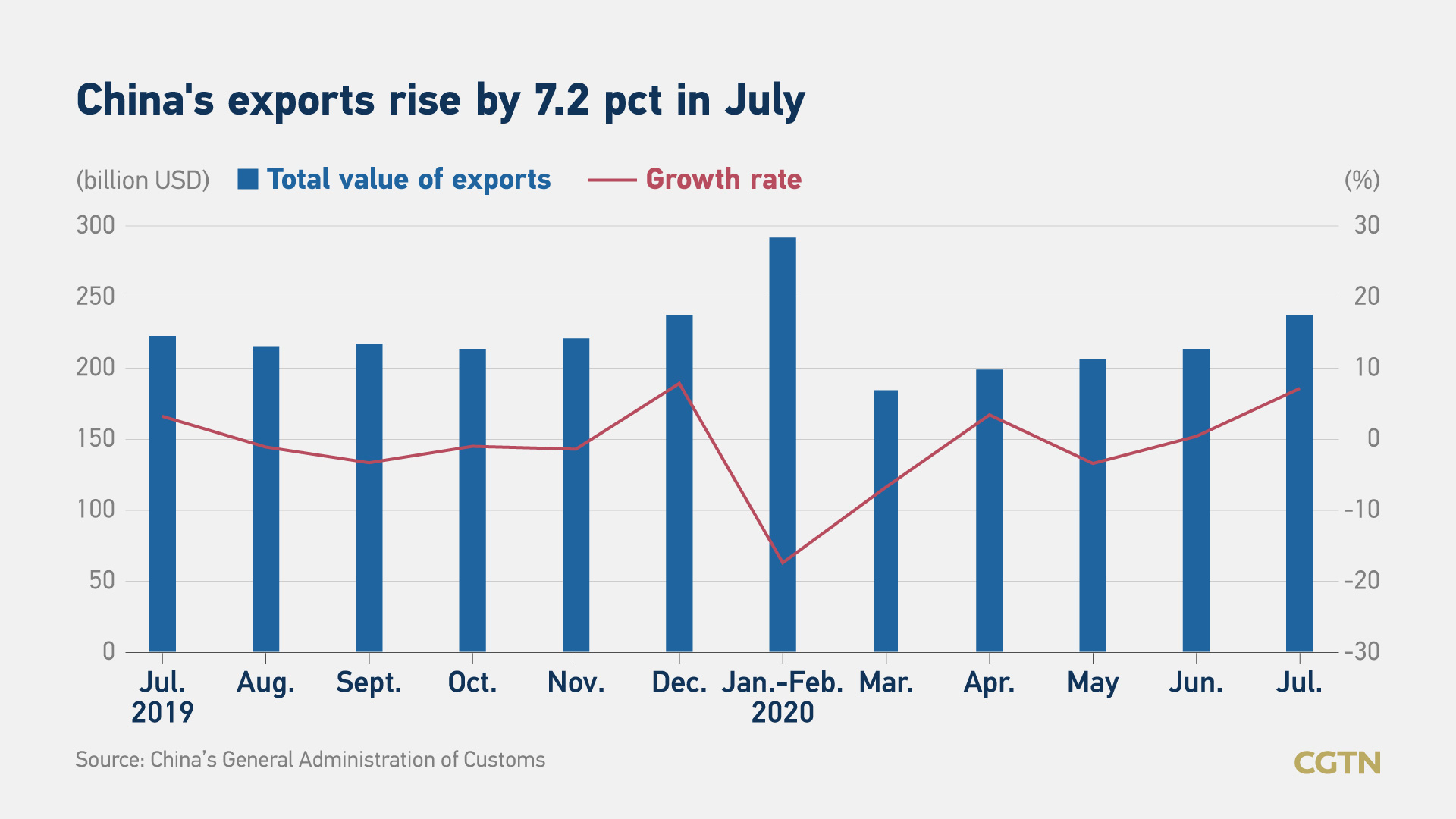 Во јули, Кина забележа зголемување на извозот за 7,2% на годишно ниво, надминувајќи ги очекувањата на аналитичарите, покажуваат најновите податоци на кинеската царинска служба. Увозот исто така порасна за 4,1%, што е повеќе од предвиденото, и покрај глобалните трговски тензии.