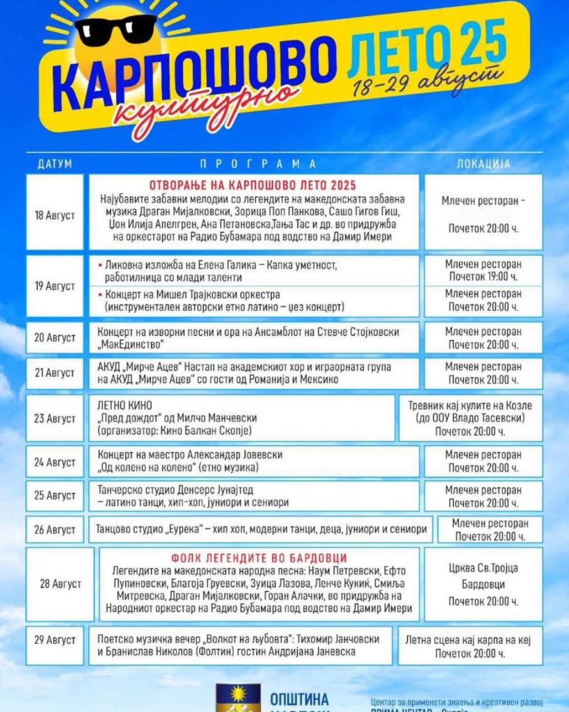 „Карпошово културно лето“ е вистинска прослава на македонската уметност – од музика и танц до литература и филм. Со внимателно избраната програма, општината им нуди на жителите и гостите незаборавни летни вечери, исполнети со врвна културна содржина и исклучиво домашен потенцијал.