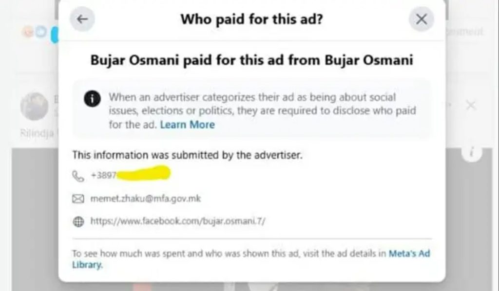 Сериозен скандал ја тресе јавноста по објавата дека службениот и-мејл и телефонски број на Мемет Жаку, вработен во Министерството за надворешни работи, биле користени за спонзорирање политичка реклама на Фејсбук во корист на Бујар Османи. Објавата е спонзорирана вчера, а доказите јасно го прикажуваат мејлот на Жаку и неговиот телефон, иако бројот е прикриен со жолта лента поради дилема дали станува збор за приватен или службен контакт.
