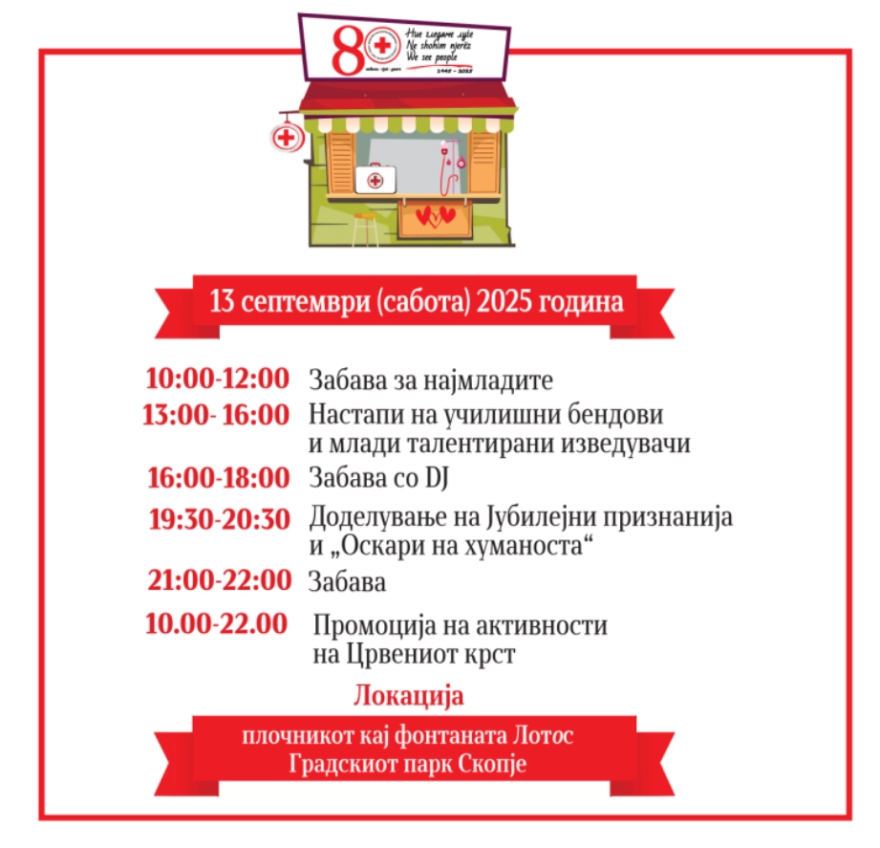 Црвениот крст на Град Скопје годинава одбележува 80 години од формирањето на организацијата. Централното одбележување на јубилејот е денеска во Градскиот парк Скопје, на плочникот кај фонтаната Лотoс. На мали куќарки т.н. хумана зона ќе бидат прикажани сите активности и социјални сервиси, придружна опрема и показни елементи преку кои граѓаните ќе имаат можност да се запознаат со активностите на организацијата, но и да се информираат што сè нуди во насока на помош и поддршка на сите граѓани.