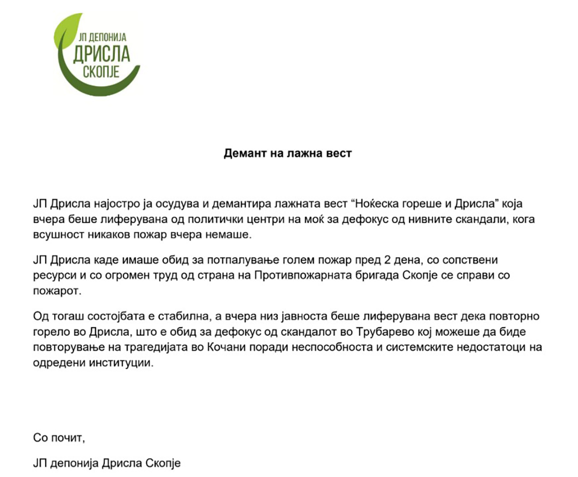 Јавното претпријатие „Дрисла“ најостро ја осуди и демантира информацијата што вчера се појави во јавноста дека на депонијата повторно имало пожар. Од претпријатието појаснуваат дека веста под наслов „Ноќеска гореше и Дрисла“ е лажна и дека се работи за пласирана дезинформација од политички центри на моќ со цел дефокусирање од актуелни скандали.