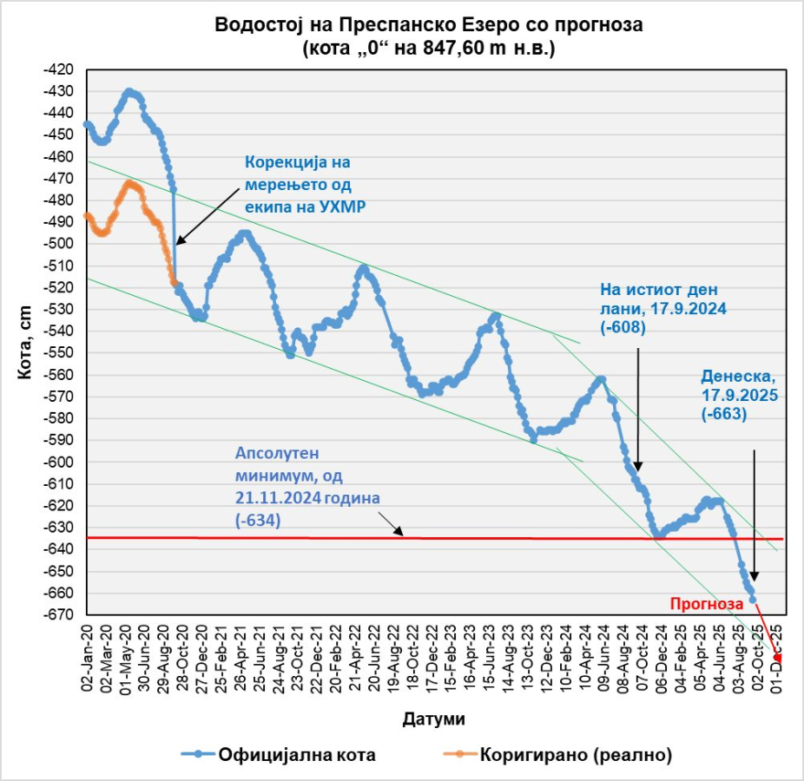„До декември има уште долг пат да се изоди и прогнозата останува за кота -690 cm“, вели професорот, посочувајќи дека езерото веќе две години губи по околу 50 сантиметри годишно, што претставува пад од приближно 125 милиони кубни метри вода.