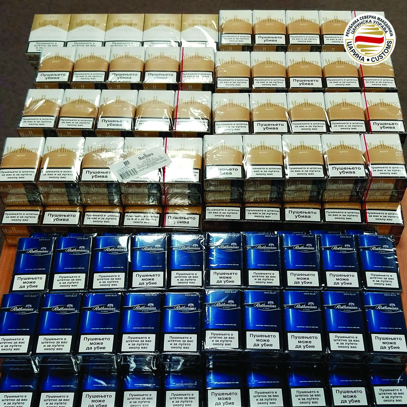 -27 штеки цигари со македонски акцизни маркички од марките Marlboro и Rothmans, откриени се на Меѓународниот аеродром Скопје при контрола на куфер на патничка која имала намера да отпатува со лет за Лондон.