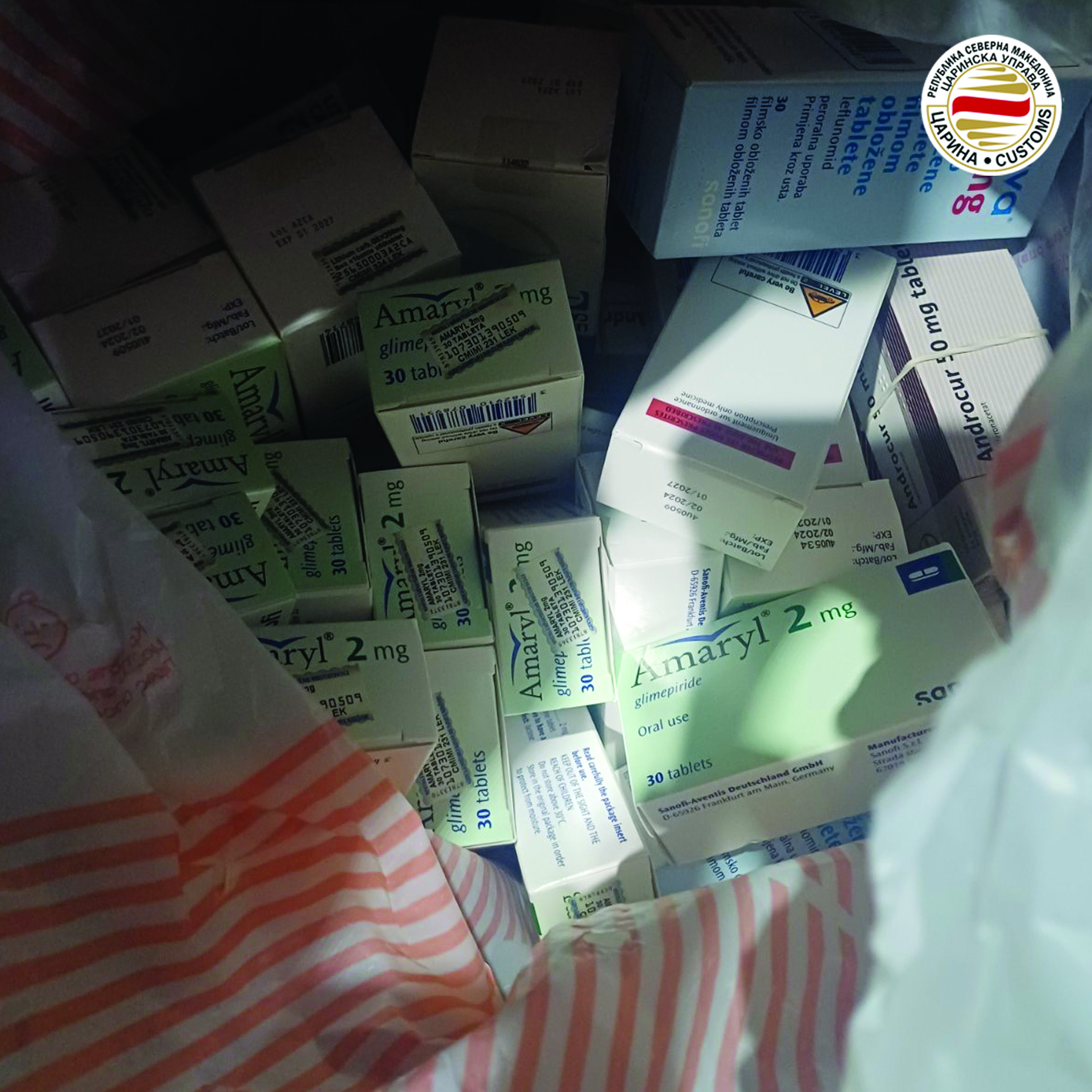 -На граничниот премин Св.Наум на влез во државата запленети се 75 пакетчиња и 123 ленти различни видови лекови (Amaryl 2 mg, Anafranil 25 mg, Procto Synalar-N 15 g, Androcur 50 mg, Pilokarpine, Arava 20 mg и други) за чиј увоз е потребна дозвола од Агенција за лекови и медицински средства. Лековите се пронајдени во една кеса и една торба сместени под предните седишта на автомобил. Вредноста на привремено задржаните лекови изнесува 83.180 денари, додека вредноста на избегнатите давачки изнесува 8.526 денари.