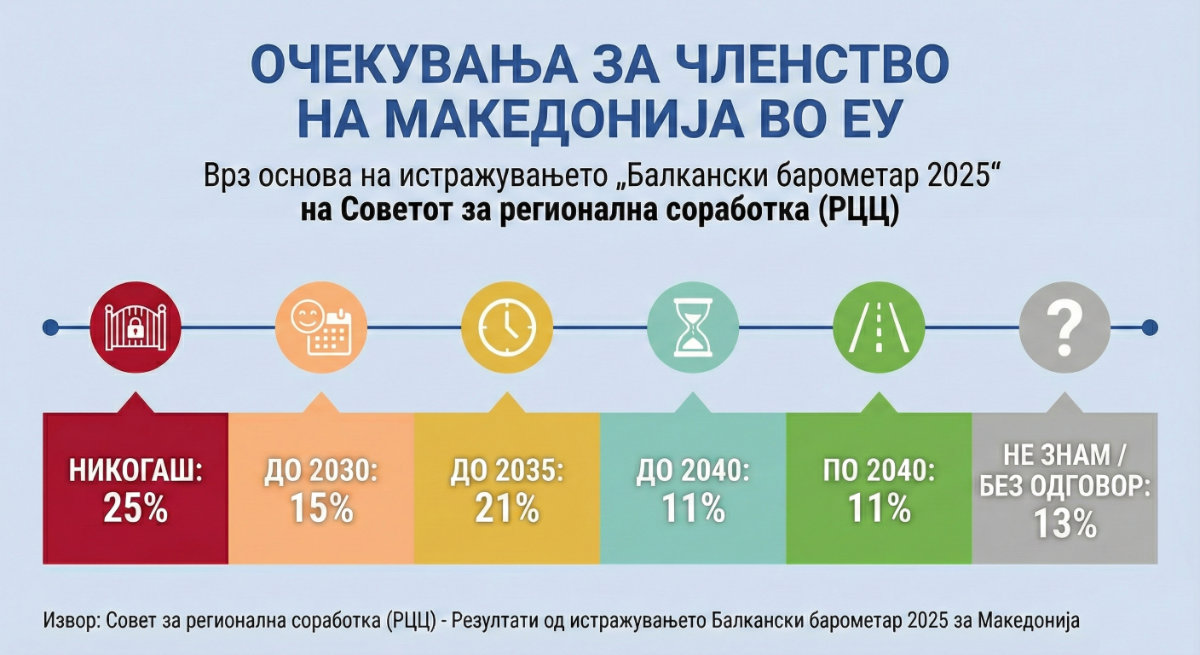 Речиси една четвртина од граѓаните на Северна Македонија, односно 25 проценти, сметаат дека земјата никогаш нема да стане членка на Европската Унија, покажуваат резултатите од најновото истражување „Балкански барометар 2025“, спроведено од Советот за регионална соработка (РЦЦ).