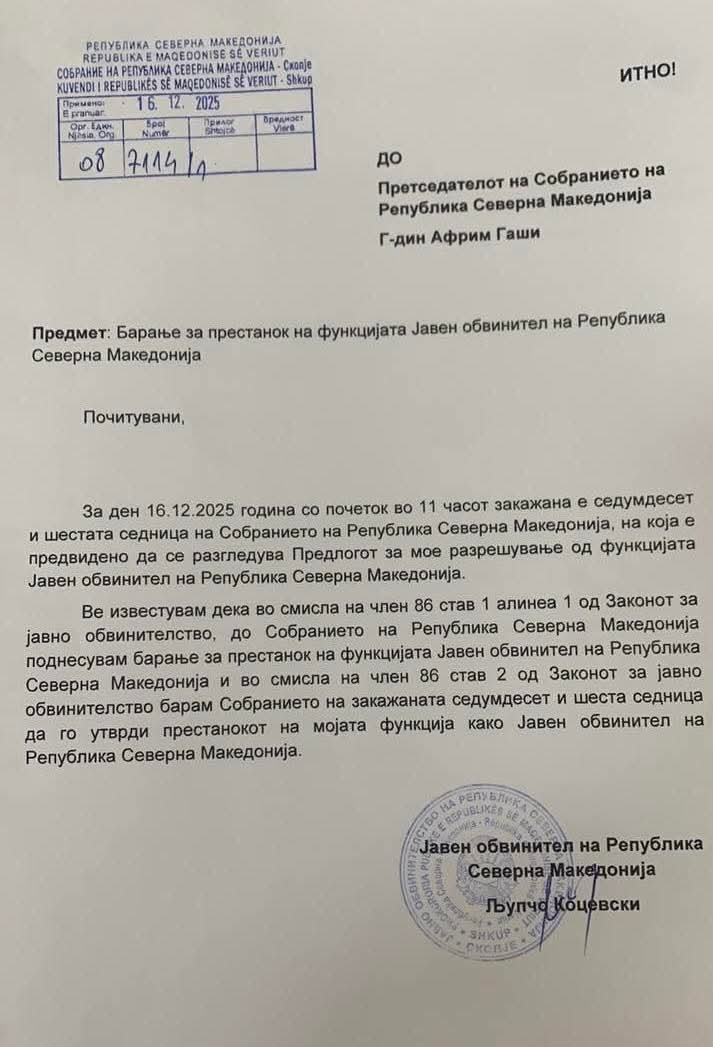 Со ова барање, практично се отвора пат за формално завршување на неговиот мандат без гласање за разрешување, а повеќе детали за понатамошната постапка и изборот на нов јавен обвинител се очекуваат по седницата на Собранието.