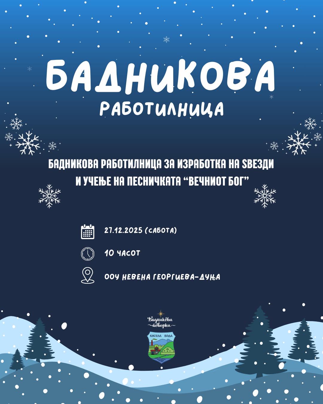 Во рамки на подготовките, Општина Кисела Вода организира и Бадникова работилница, која ќе се одржи во сабота, 27 декември 2025 година, со почеток од 10:00 часот, во спортската сала на ООУ „Невена Георгиева-Дуња“.
