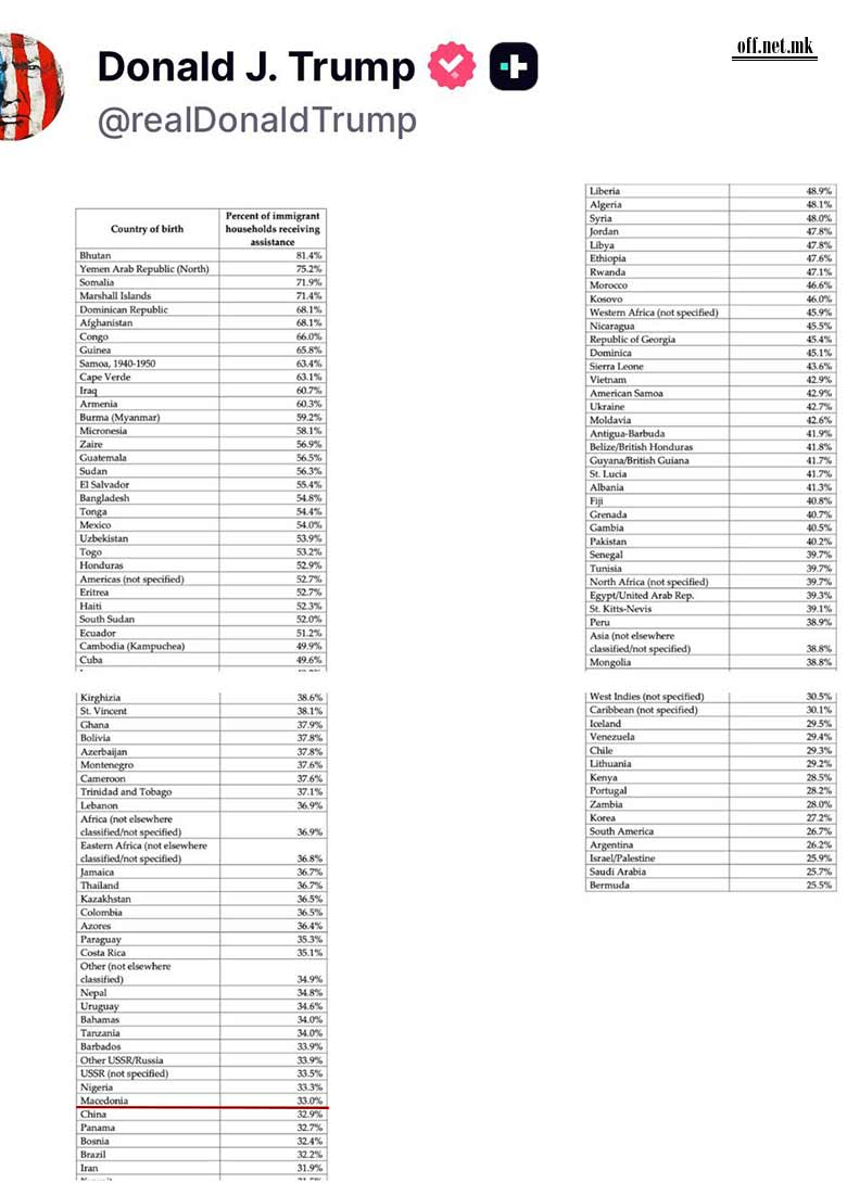 Американскиот претседател Доналд Трамп објави табела со податоци за тоа колкав процент од мигрантските домаќинства во Соединети Американски Држави се корисници на државна социјална помош, при што меѓу наведените земји се појавува и Република Македонија – без употреба на силуваната придавката на „С“.