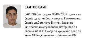Министерство за внатрешни работи вечерва објави потерница по 18-годишниот Саитов Саит, осомничен дека со автомобил прегазил пешак во скопската населба Капиштец, по што избегал од местото на несреќата и ја напуштил државата преку Табановце. Саитов Саит е роден на 6 април 2007 година во Скопје и се бара по централна и меѓународна потерница, распишана по … Continue reading МВР распиша меѓународна потерница по 18-годишник осомничен за смртна сообраќајка во Капиштец