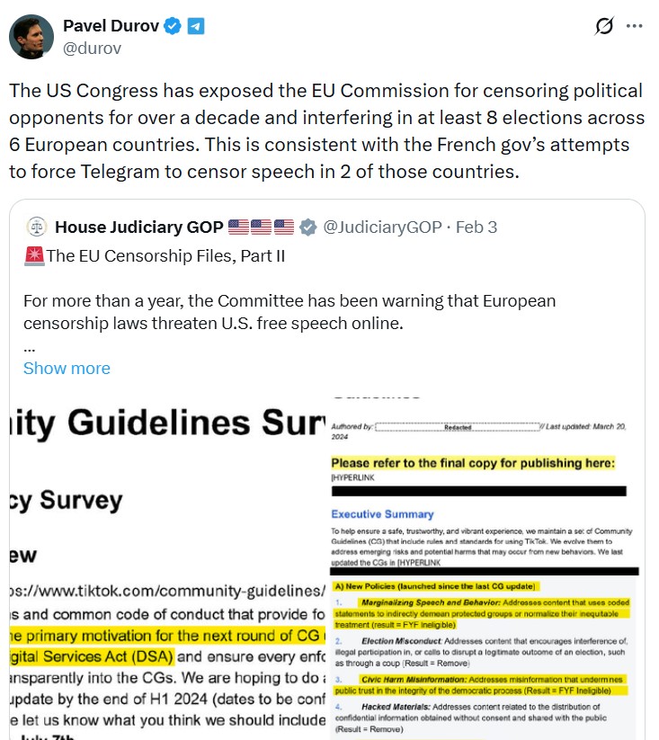 Во објава на социјалната мрежа X, Дуров се повика на извештај на Комитетот за правосудство на Претставничкиот дом на САД, тврдејќи дека Европската комисија вршела притисок и цензура врз политички противници во одделни земји членки на ЕУ.