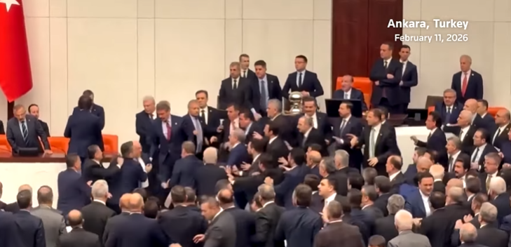 Турскиот парламент во Анкара беше сцена на масовна тепачка меѓу пратеници од владејачкото мнозинство и опозицијата, откако беше покренато прашањето за именувањето на Акин Гурлек за министер за правда.