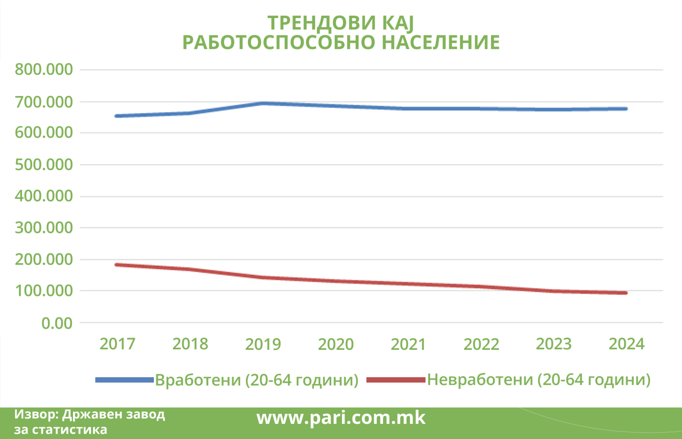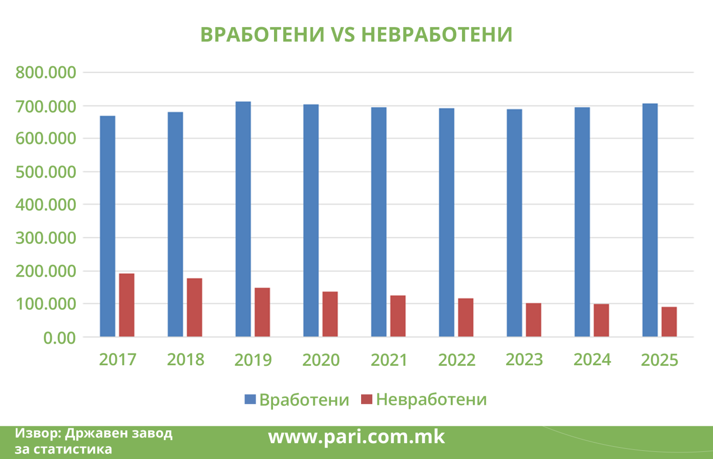 Од 2017 година до третиот квартал од 2025 година бројот на вработени се зголемил од 668.958 на 706.165 лица – раст од околу 37.000. Во истиот период бројот на невработени е намален од 191.728 на 91.765 лица – пад од речиси 100.000.