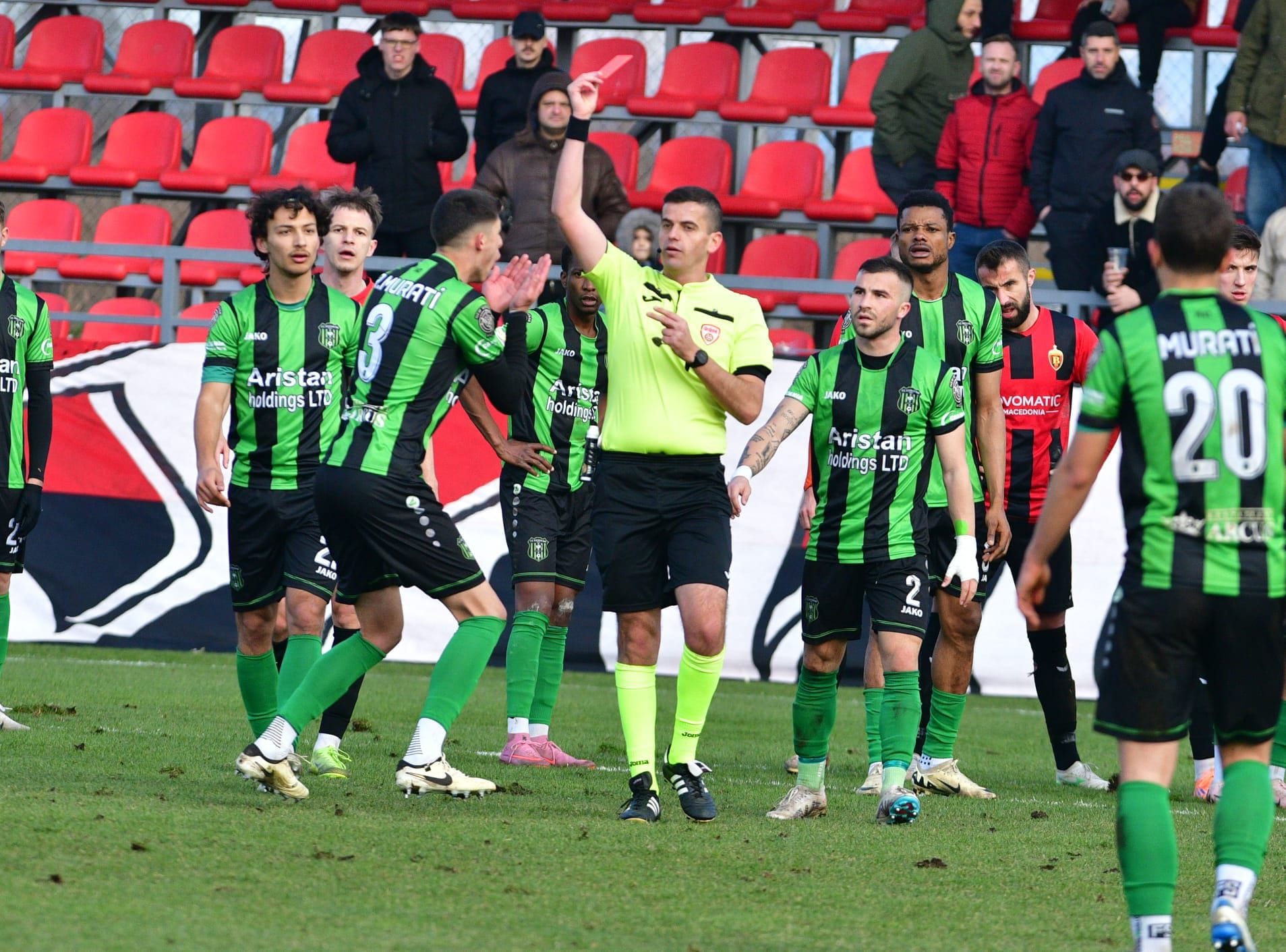 Според ФФМ, во 87. минута од натпреварот бил доделен директен црвен картон за играчот со број 3 од гостинската екипа, поради плукање кон судијата. Главниот судија се наоѓал на околу еден метар од инцидентот и јасно го забележал прекршокот, по што без двоумење покажал директен црвен картон.