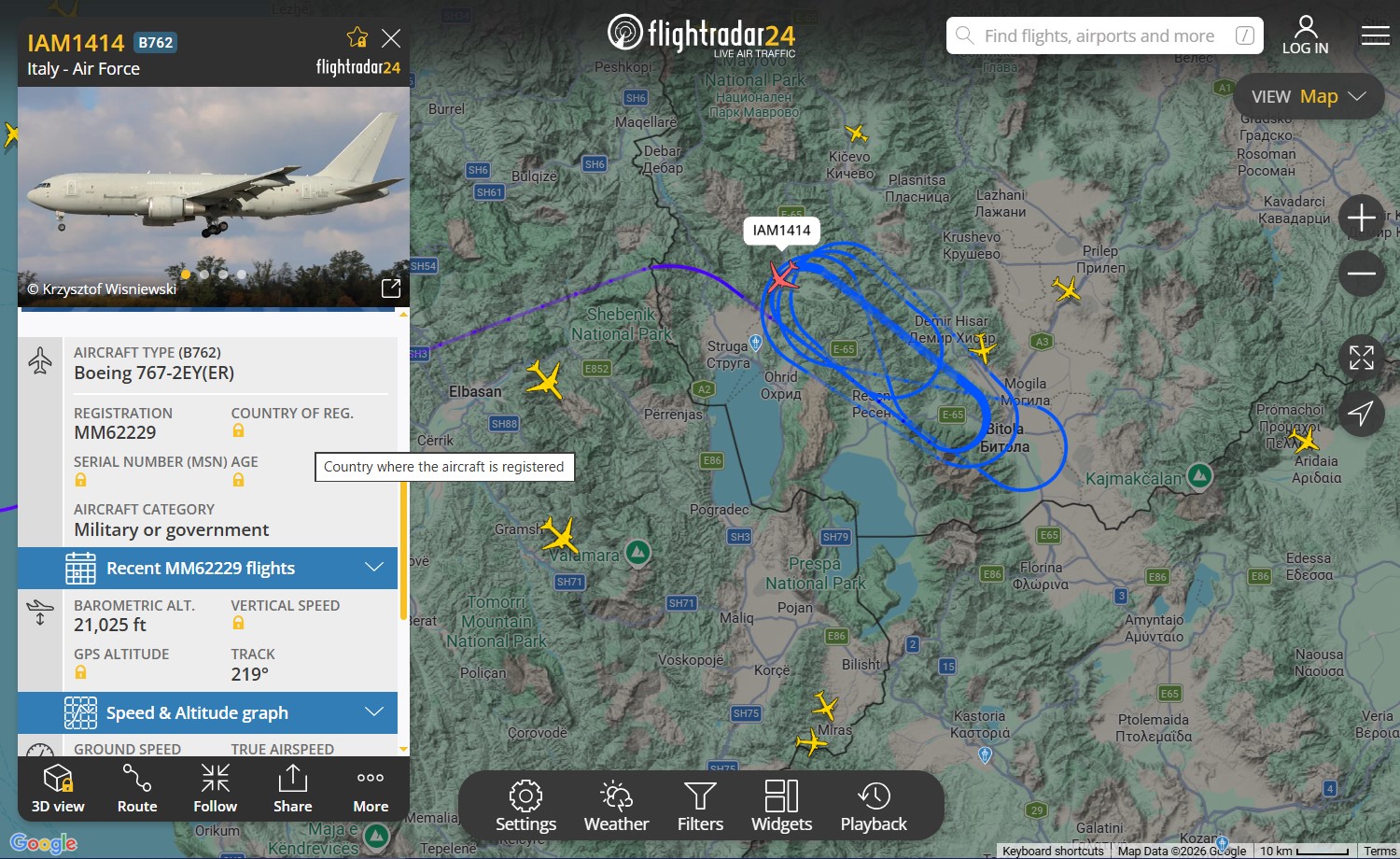 Италијански воен авион денеска неколку часа кружи над југозападниот дел на Македонија, што предизвика внимание и прашања во јавноста, особено откако траекторијата на летот беше забележана на апликацијата Flightradar24.