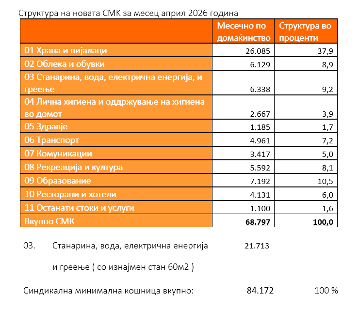 Синдикалната кошница порасна на 68.797 денари во април 2026 година, што е за 979 денари повеќе во споредба со март, кога изнесуваше 67.818 денари.